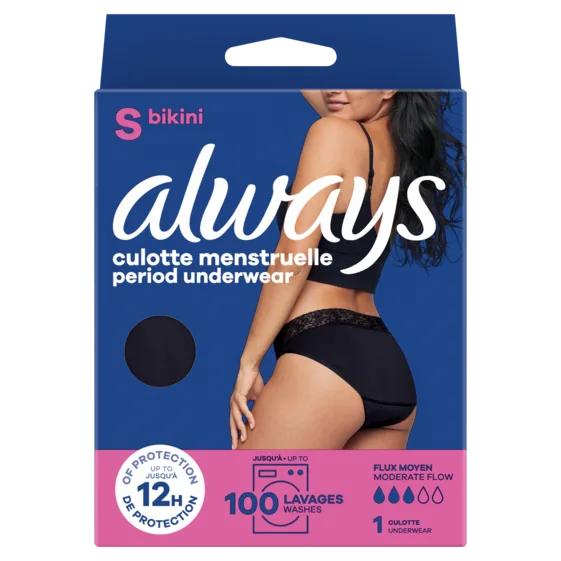 Nos culottes menstruelles Always Bikini sont lavables jusqu’à 100 fois, ce qui garantit une utilisation durable. Rincez-les, lavez-les à 30 °C (sans utiliser d’adoucissant), séchez-les et elles seront prêtes à être utilisées encore et encore. Composées d’un tissu extensible, doux et micro-aéré, les nouvelles culottes menstruelles Always vous offrent un confort de jour comme de nuit, pour que vous puissiez vous déplacer librement.