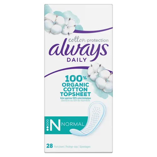 Les protège-slips Always Daily Cotton Protection Normal ont un voile composé à 100 % de coton biologique. Par ailleurs, ils sont sans parfum. Ils sont fins et flexibles, conçus pour être confortables et sont dotés d’un cœur absorbant. De plus, ils ont un design micro-aéré. Ces protège-slips ont été approuvés par les dermatologues de la SHA (Skin Health Alliance) et sont certifiés par Cotton Inc.