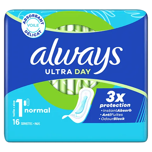 Dites oui à une triple protection avec les Always Ultra Day Normal serviettes menstruelles Normal (taille 1). Les serviettes menstruelles Always avec leur voile supérieur absorbant et doux au toucher absorbent le flux menstruel en quelques secondes grâce à leur technologie InstantAbsorb et aident à prévenir les fuites et les odeurs grâce aux technologies AntiFuites et OdourBlock. Pour une protection supplémentaire la nuit, essayez les tailles Always Nuit. Les serviettes sont approuvées par les dermatologues de la Skin Health Alliance.